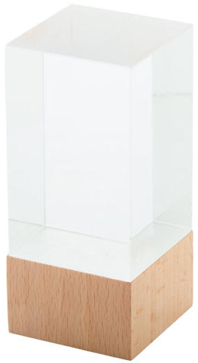 Üvegtrófea bükkfa alappal, kraft papír ajándékdobozban.