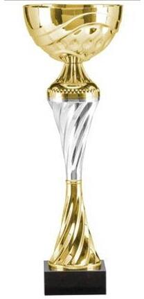 Fém serleg, csavart arany és ezüst színű csavart oszloppal, elegáns fekete talpon. Magasság: 29cm. Csésze átmérő: 10cm. Az ár tartalmazza a feliratozást is, gravírozott táblán.