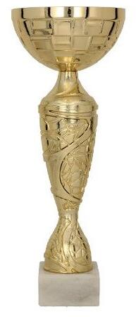 Különleges díszítésű, arany színű serleg, márványtalpon. Magassága: 24,5cm. Csésze átmétője: 9cm. Az ár tartalmazza a serleg felíratozását, gravírozott táblával.